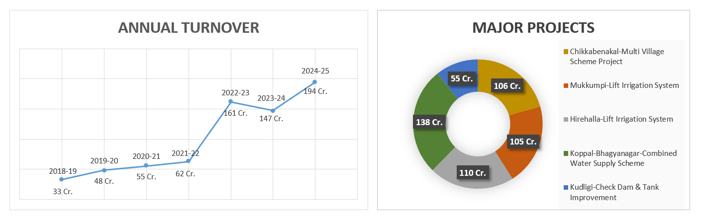 The Company is growing year by year and bagging various Government orders. We have diversified our business into new sectors from construction of Roads, Canal/Check Dam/ Bridge cum Barrage to Lift Irrigation to Water Supply Schemes /Industrial